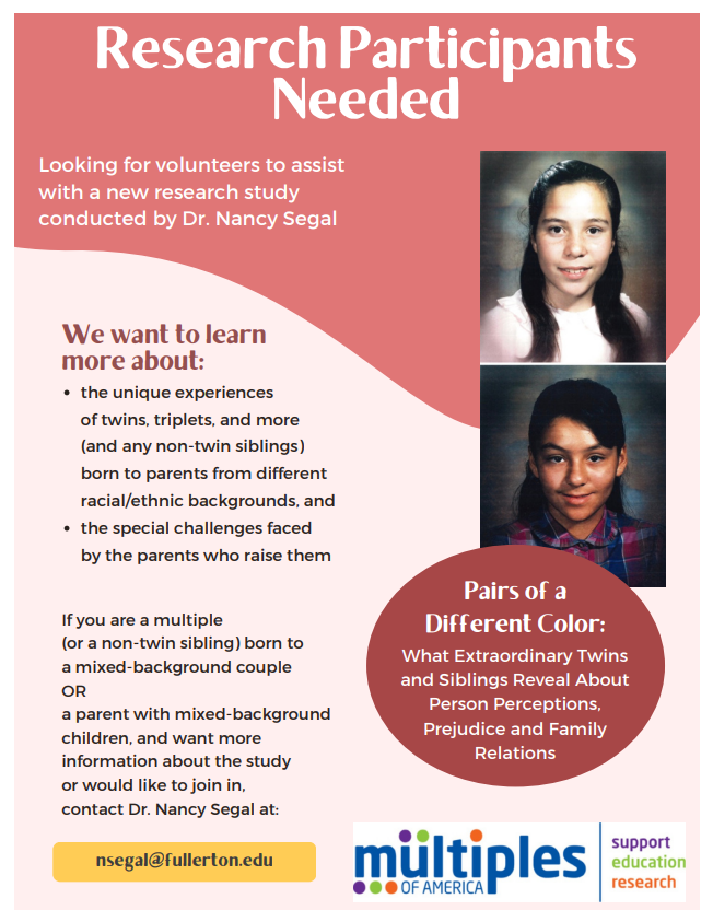 PURPOSE OF STUDY: In this study, the researcher seeks to learn more about the unique experiences of twins, triplets, and more (and any non-twin siblings) born to parents from different racial/ethnic backgrounds as well as the special challenges faced by parents who raise them. Information about the experiences of the multiples at home, in school, and in the community and special parenting challenges will be gathered using a brief questionnaire and interview.Â